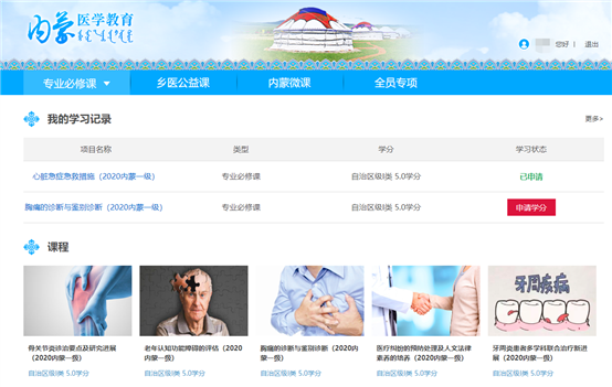 登录网站,映入眼帘的是蓝天白云下的蒙古包,学习平台、管理平台一目了然。在专业必修课栏目里,系统会对学员所在单位级别和感兴趣的学科进行判断,自动分配课程,从而达到继续医学教育分级分类培训。乡医公益课,是为内蒙古自治区广大乡村医生量身定制的免费课程。内蒙微课,是内蒙古自治区医学会与华医网联合出品的医学教育微课,选取一些特定题材,对继续医学教育学习方式进行一次创新尝试。全员专项,在2020年抗击新冠肺炎疫情期间,上线了《新型冠状病毒感染的肺炎防治知识培训》系列课程,当日学习人数达到2万余人,截止4月底,培训人次已达到17万。