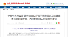 2月16日,中国机构编制网发布《中共中央办公厅国务院办公厅关于调整国家卫生健康委员会职能配置、内设机构和人员编制的通知》。