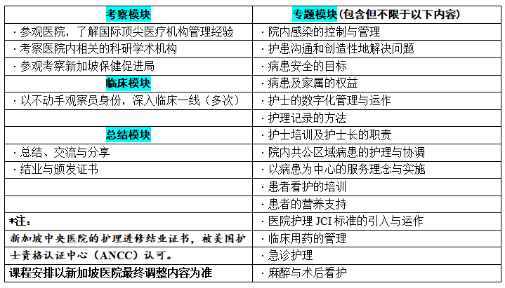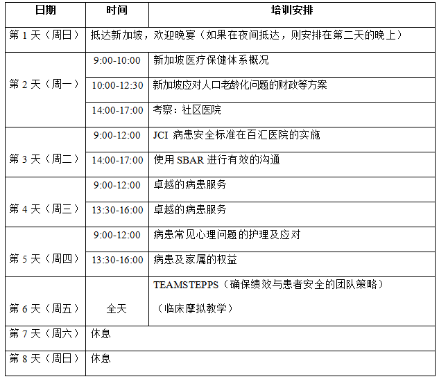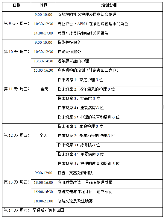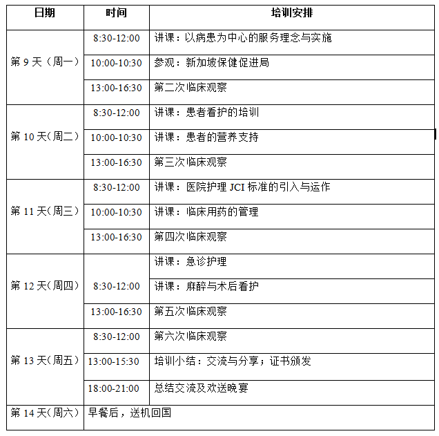 行程安排:14天(含往返),主要内容包括医院护理专科深入参访、护理领域专题讲座与授课,与顶级护理专家交流、深入临床体验并模拟实操等。