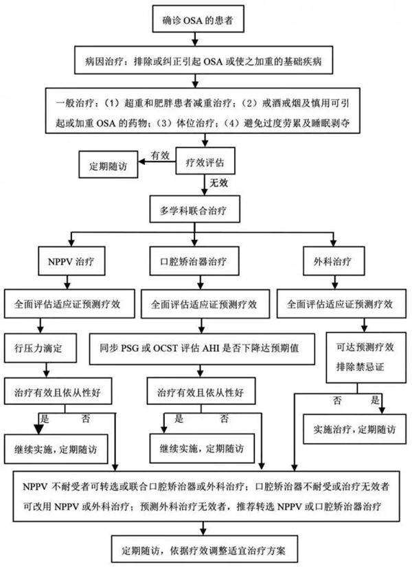 (1)口腔矫治器可作为单纯熟症和轻、中度患者的一线治疗方法,可与手术或NPPV联合应用治疗重度OSA;