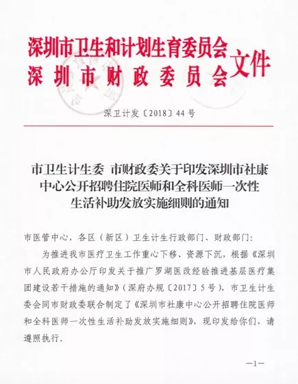 值得注意的是,细则实施对象为2017年1月1日后(以发布公开招聘公告时间为准),经市、区卫生行政部门或者市公立医院主管部门通过公开招聘录用到社康中心(含深圳市一类,二类社康中心及社康站,以下简称“社康中心”)工作,且取得国家认可的住院医师或者全科医师规范化培训合格证的毕业生。