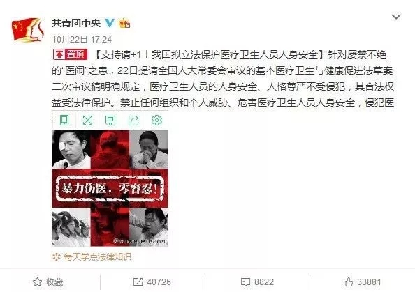 该法律条例的微博一出,网友纷纷留言,支持!超级支持!+1支持!+10010支持!+10086支持!保护医护人员安全,拒绝暴力伤医!也获得了医疗工作者的支持,称,我又热爱自己的职业了。