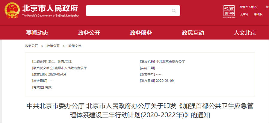 6月9日,北京市人民政府办公厅关于印发《加强首都公共卫生应急管理体系建设三年行动计划(2020-2022年)》(以下简称《建设计划》》)的通知。