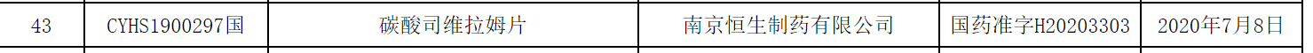 7月13日,南京恒生制药4类仿制药碳酸司维拉姆片获得国家药监局批准上市,该药为国内首仿。