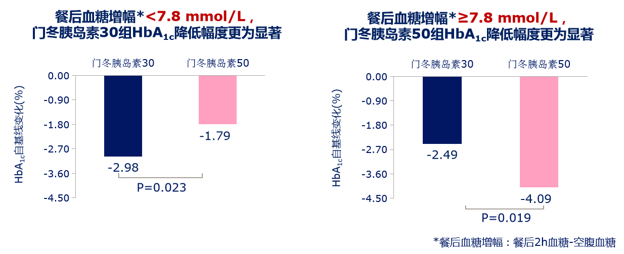 这项研究更重要的意义,在于探索中国T2DM患者适合低/中预混胰岛素起始的治疗切点,即基线餐后血糖增幅7.8mmol/L。如图1所示,在基线餐后血糖增幅<7.8 mmol/L的人群中,低预混组HbA1c降幅更显著(P=0.023);在餐后血糖增幅≥7.8 mmol/L的患者中,中预混组HbA1c降幅更优(P=0.019)。与此同时,在餐后2小时血糖≥17.6 mmol/L患者中,中预混组也表现出较低预混胰岛素降低HbA1c更大的优势。