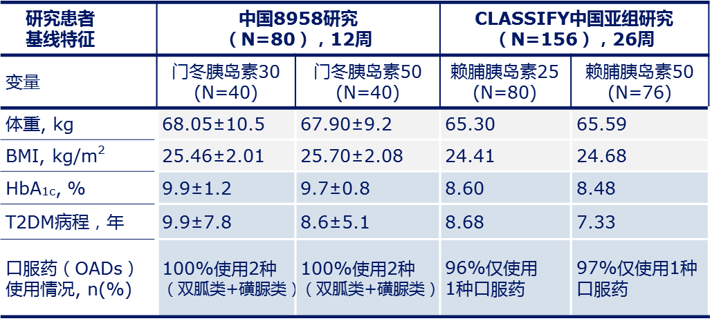 8958研究的结果与另一项在T2DM人群中对比低/中预混赖脯胰岛素的CLASSIFY研究7结果并不一致。CLASSIFY中国亚组分析发现,在餐后血糖增幅≥4.4mmol/L或餐后2小时血糖≥13.5mmol/L的人群中,中预混胰岛素的疗效更优。下表(表1)对比了两个研究的基线特征,不难看出,除了观察药物的不同,8958研究纳入的患者基线HbA1c更高,病程更长,使用口服药种类更多,提示其病情更严重、血糖控制更差,胰岛β细胞功能可能更差。