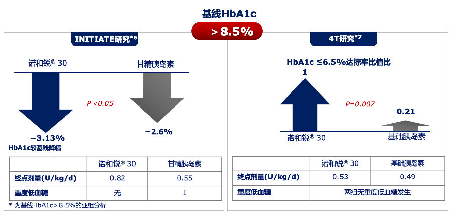 INITIATE研究是一项为期 28周,平行、随机对照、开放性的治疗达标研究,纳入233例口服药血糖控制不佳2型糖尿病患者起始胰岛素治疗,比较诺和锐®30每日两次注射与甘精胰岛素每日一次注射的疗效与安全性。4T研究是由英国牛津大学牵头进行的一项为期3年的随机对照试验,共纳入来自58个医疗中心的708例接受最大耐受剂量的二甲双胍和磺脲类药物治疗但血糖控制仍不理想(HbA1c 7.0%~10.0%)的患者,随机分为接受预混胰岛素组、餐时胰岛素组、基础胰岛素组。两个研究结果均显示,对于口服药联合方案基线HbA1c>8.5%的2型糖尿病患者,起始诺和锐® 30 BID相比基础胰岛素QD可以更显著的降低HbA1c且HbA1c达标率更高6~7,且安全性均低(详见图2)。