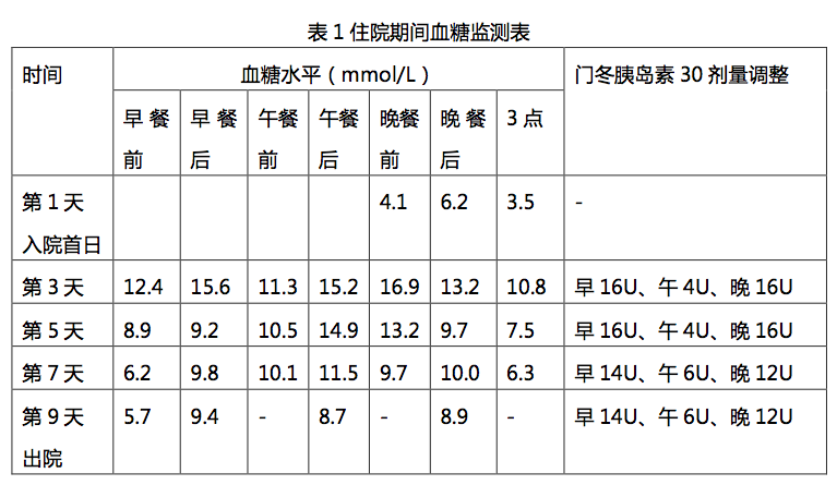 故考虑到降糖方案的简单便利、经济性、操控性等原因,采用了优化胰岛素降糖方案为:门冬胰岛素30日三次餐前即刻皮下注射,对空腹血糖及三餐后血糖兼顾,且不增加低血糖风险,同时单一一种胰岛素注射装置解决一天血糖问题,操控性加,方案简单便利,容易使患者接受,且费用上较日四次强化治疗及胰岛素泵治疗均明显降低,具有经济学优势。故将降糖方案改为门冬胰岛素30早16U 午4U 晚16U餐前皮下注射,二甲双胍改为2.0g/天。住院期间血糖监测结果见表1。
