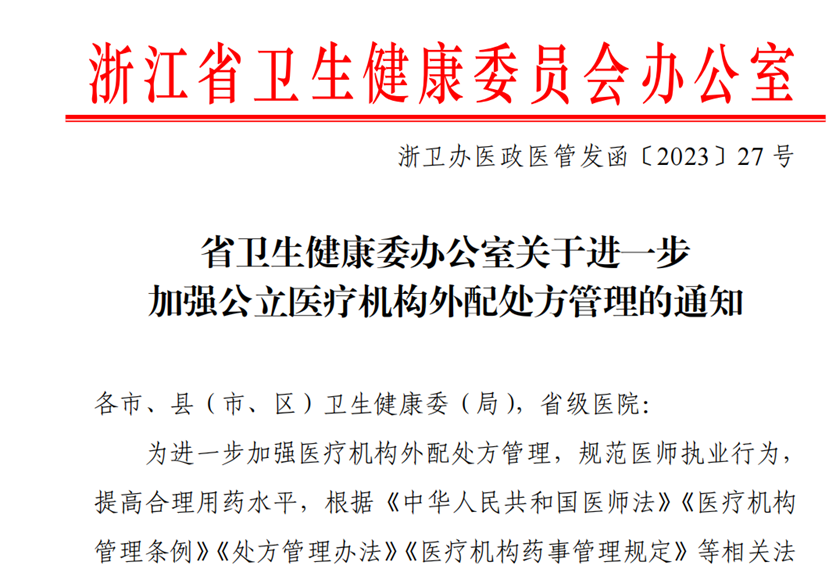 浙江省本次发布的《通知》指出,外配处方是患者疾病治疗的补充,也是方便患者就医的措施,但如外配处方使用不规范或管理不善,容易出现用药风险和行风风险。