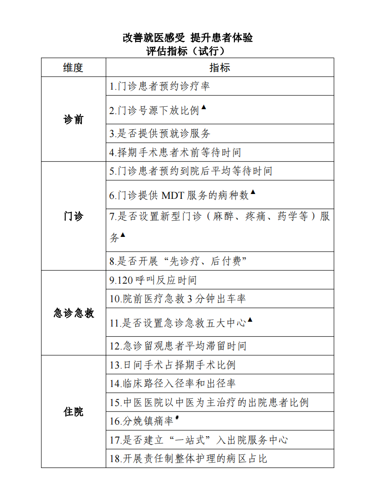 值得关注的是,涉及疼痛管理等体现“医疗温度”的指标也同样被列入了《操作手册》内,例如是否设置新型门诊(麻醉、疼痛、药学等)服务(指标7)与分娩镇痛率(指标16),充分体现了“以病人为中心”的服务理念。