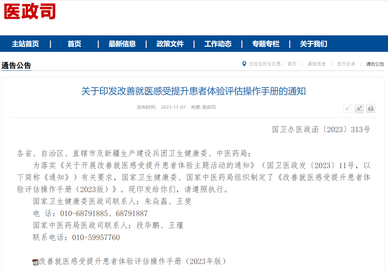 11月7日,国家卫生健康委与国家中医药局重磅发布了《改善就医感受提升患者体验评估操作手册(2023版)》(以下简称《操作手册》),涵盖了诊前、门诊、急诊急救、住院、诊后和全程6大维度的27项指标,每一项指标后还详细注明了政策依据、定义、目标和考核细则等内容。