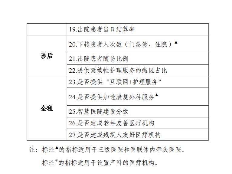除此以外,是否建成老年友善医疗机构(指标26)、是否建成残疾人友好医疗机构(指标27)等指标也已定性的形式被写入《操作手册》,充分体现了对特殊群体的关注。