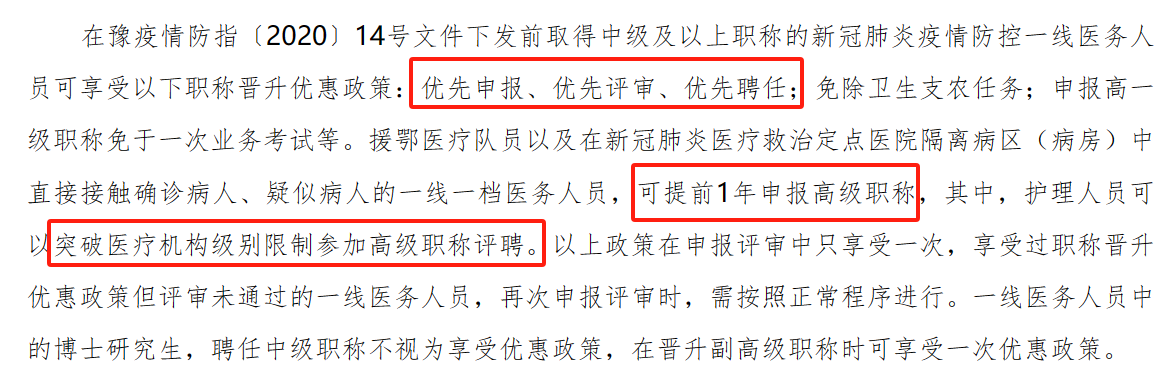 豫疫情防指〔2020〕14号文件下发前取得中级及以上职称;被确定为新冠肺炎疫情防控一线医务人员!