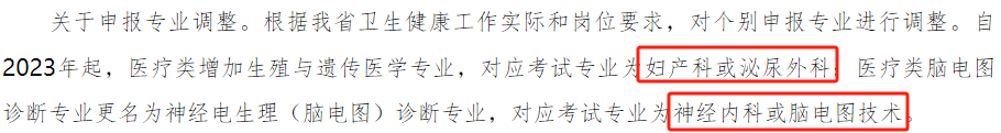 自2023年起,医疗类增加生殖与遗传医学专业,对应考试专业为妇产科或泌尿外科;医疗类脑电图诊断专业更名为神经电生理(脑电图)诊断专业,对应考试专业为神经内科或脑电图技术。