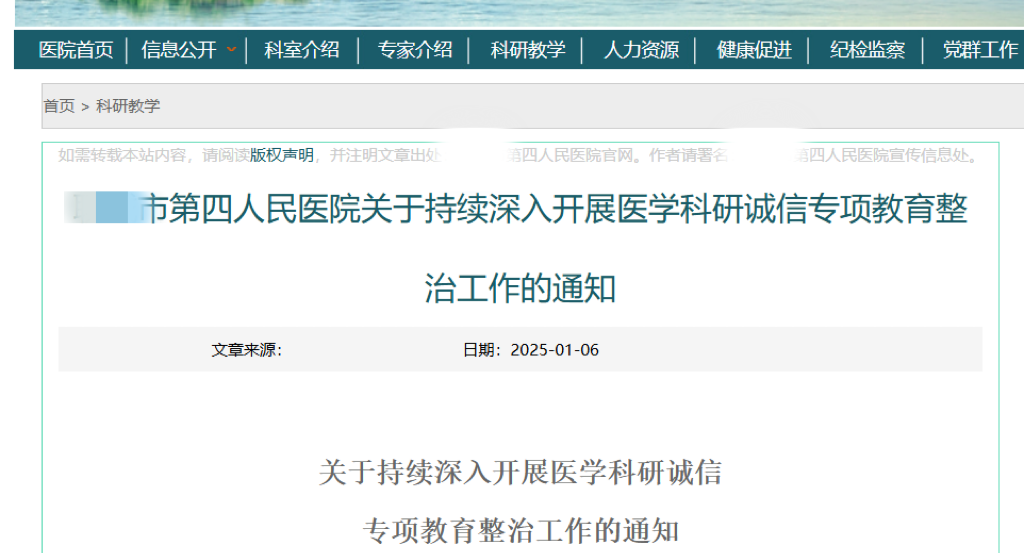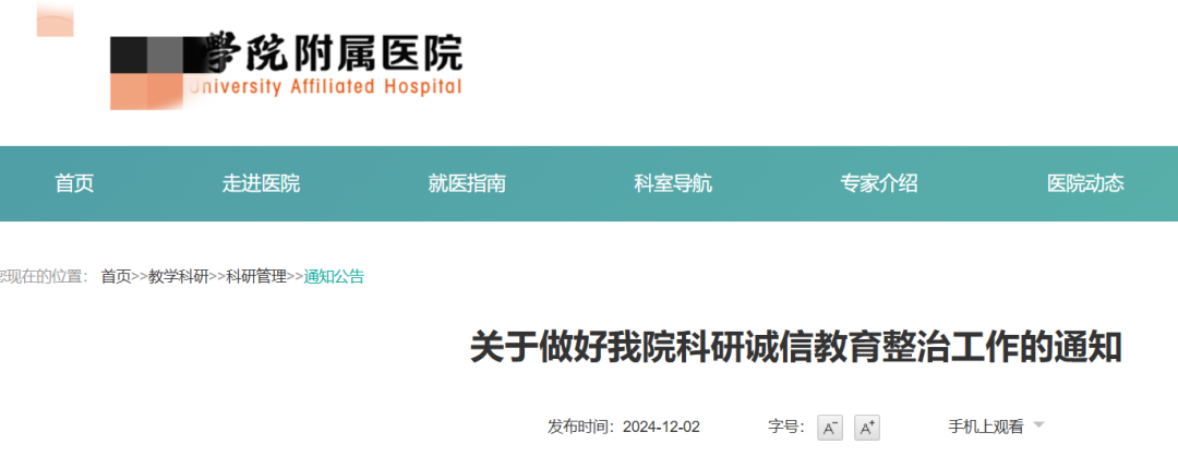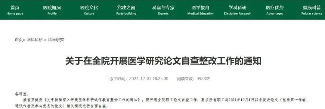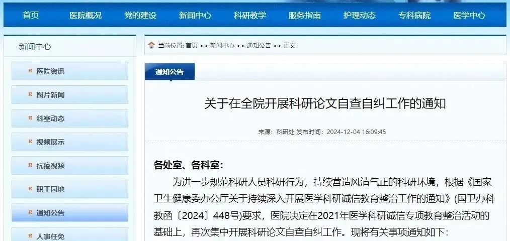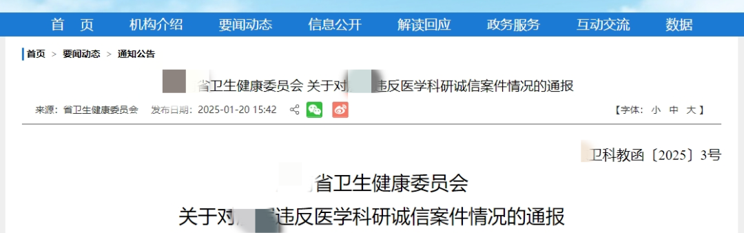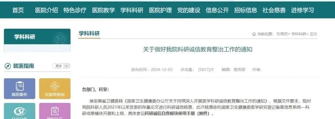 取消职务职称晋升等资格 原因为何? 近日,一省卫生健康委员会发布了《关于对某医生违反医学科研诚信案件情况的通报》。 通报称,某市人民医院某医生存在科研失信行为,并公布了对其的处理结果。通知还表示,该案件暴露了某市人民医院在科研管理方面未严格履行单位职责,医院内部科研管理体系不完善,制度落实不到位,科研项目审查不实不严,特此提出通报批评: 处理结果 被调查人某医生存在编造研究过程、伪造研究结果、伪造实验数据和结论,以及提供虚假信息作为省卫生健康行业科研项目结题验收的行为。按照《科研失信行为调查处理规则》第二十九条、第三十二条规定,论文作者科研失信行为情节严重,给予以下处理: 1.全省公开通报; 2.进行科研诚信诫勉谈话; 3.取消5年内申请或申报科技奖励、科技人才称号和职务职称晋升等资格; 4.禁止承担或参与科技计划(专项、基金等)项目等财政性资金支持的科技活动5年; 5.取消作为提名或推荐人、被提名或被推荐人、评审专家等资格5年; 6.取消学会、协会等学术团体以及学术、学位委员会等学术工作机构的委员或成员资格; 7.记入科研诚信严重失信行为数据库; 8.撤销利用科研失信行为获得的医院科研奖励,退还违规使用的经费; 9.被处理人是中共党员,根据《中国共产党纪律处分条例》,相关材料移交医院纪委处理。 从该通报中我们还了解到,2024年10月,该省卫健委组织开展2024年度省卫生健康行业科研项目结题评审工作。该项工作的开展,是因为国家卫生健康委正在面向卫生健康系统持续深入开展医学科研诚信专项整治工作。 多地卫健委通知 医院开展全面自查 近日,山东、江西、陕西、安徽、河南等地有多家医院官网发文称,接省卫健委通知,根据《国家卫生健康委办公厅关于持续深入开展医学科研诚信教育整治工作的通知》要求,集中开展科研论文自查自纠工作。 发文的各医院也均明确了核查范围为2021年10月1日以来发表的论文,自查区间长达3年。 值得注意的是,在2021年国家卫健委、科技部等20部委联合发布的《科研诚信案件调查处理规则(试行)》中,就对科研失信行为提出了非常严厉的处理措施: (一)科研诚信诫勉谈话; (二)一定范围内或公开通报批评; (三)暂停财政资助科研项目和科研活动,限期整改; (四)终止或撤销财政资助的相关科研项目,按原渠道收回已拨付的资助经费、结余经费,撤销利用科研失信行为获得的相关学术奖励、荣誉称号、职务职称等,并收回奖金; (五)一定期限直至永久取消申请或申报科技计划项目(专项、基金等)、科技奖励、科技人才称号和专业技术职务晋升等资格; (六)取消已获得的院士等高层次专家称号,学会、协会、研究会等学术团体以及学术、学位委员会等学术工作机构的委员或成员资格; (七)一定期限直至永久取消作为提名或推荐人、被提名或推荐人、评审专家等资格; (八)一定期限减招、暂停招收研究生直至取消研究生导师资格; (九)暂缓授予学位、不授予学位或撤销学位; (十)其它处理。 另外,科技部办公厅在2023年也曾印发过《关于开展论文学术不端自查和挂名现象清理工作的通知》,有多所医学院校及机构发文响应,当时规定的自查清理范围为2018年1月1日以来的论文。 学术造假“一票否决” 国家加强职称评审监管 事实上,早在2020年12月1日中华人民共和国人力资源和社会保障部发布《关于深化卫生专业技术人员职称制度改革的指导意见(征求意见稿)》中,就已经提出了学术造假“一票否决制”: 注重医德医风考核。加强对医德医风和从业行为的评价,将医务人员在重大自然灾害或突发公共卫生事件中的表现作为医德医风考核的重要内容。用人单位须建立健全医德医风考核制度,将利用职务之便索要、非法收受财物或牟取其他不正当利益等行为纳入考核范围。完善诚信承诺和失信惩戒机制,实行学术造假“一票否决制”,对通过弄虚作假、暗箱操作等违纪违规行为取得的职称,一律予以撤销。 自2023年以来,为落实国家提出的深化职称制度改革,全国有多地发布卫生职称评定相关的文件。在此之中,几乎所有省市均在文件中再次强调了要实行学术造假“一票否决制”。也有的地区明确了要对已取得职称的予以撤销。 而就在今年7月,国家人力资源社会保障部印发了《职称评审监管暂行办法》(以下简称《办法》)并开始执行。《办法》中对职称评审的监管力度实现了前所未有的加强,堪称史诗级变革。 《办法》聚焦申报人、评审专家、职称评审相关工作人员等3类重点人群和评审单位、申报人所在单位等2类重点单位进行监管。 在对申报人重点监管的内容之中,也包括了医学科研诚信问题: (二)在职称评审中提供虚假材料、论文造假代写、剽窃他人作品或者学术成果,业绩成果不实或者造假等。 申报人在提交职称申报材料时应同时签订个人承诺书,对申报材料真实性等进行承诺,承诺不实的,3年内不得申报评审职称。申报人存在本办法第五条所规定违规行为之一的,记入诚信档案库,记录期限为3年,作为以后申报评审职称的重要参考。申报人通过本办法第五条所规定违规行为取得的职称,一经核实即由人力资源社会保障部门或者评审单位予以撤销。 而除了医学科研诚信方面的问题之外,《职称评审监管暂行办法》还要求对申报人重点监管以下方