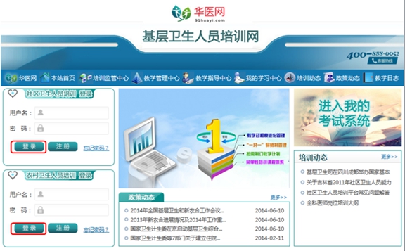 如果您已经是基层卫生人员培训网的会员,在页面左侧登录区内输入您的用户名和密码,点击“登录”即可。(如图示)